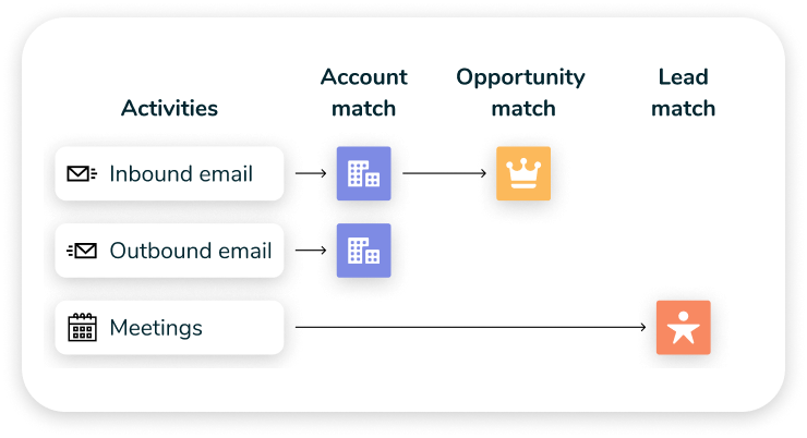 We capture every email, meeting, contact, and buying signals across the entire customer lifecycle. No plugins to install, no behavior change required from your reps. If it happens, we record it.