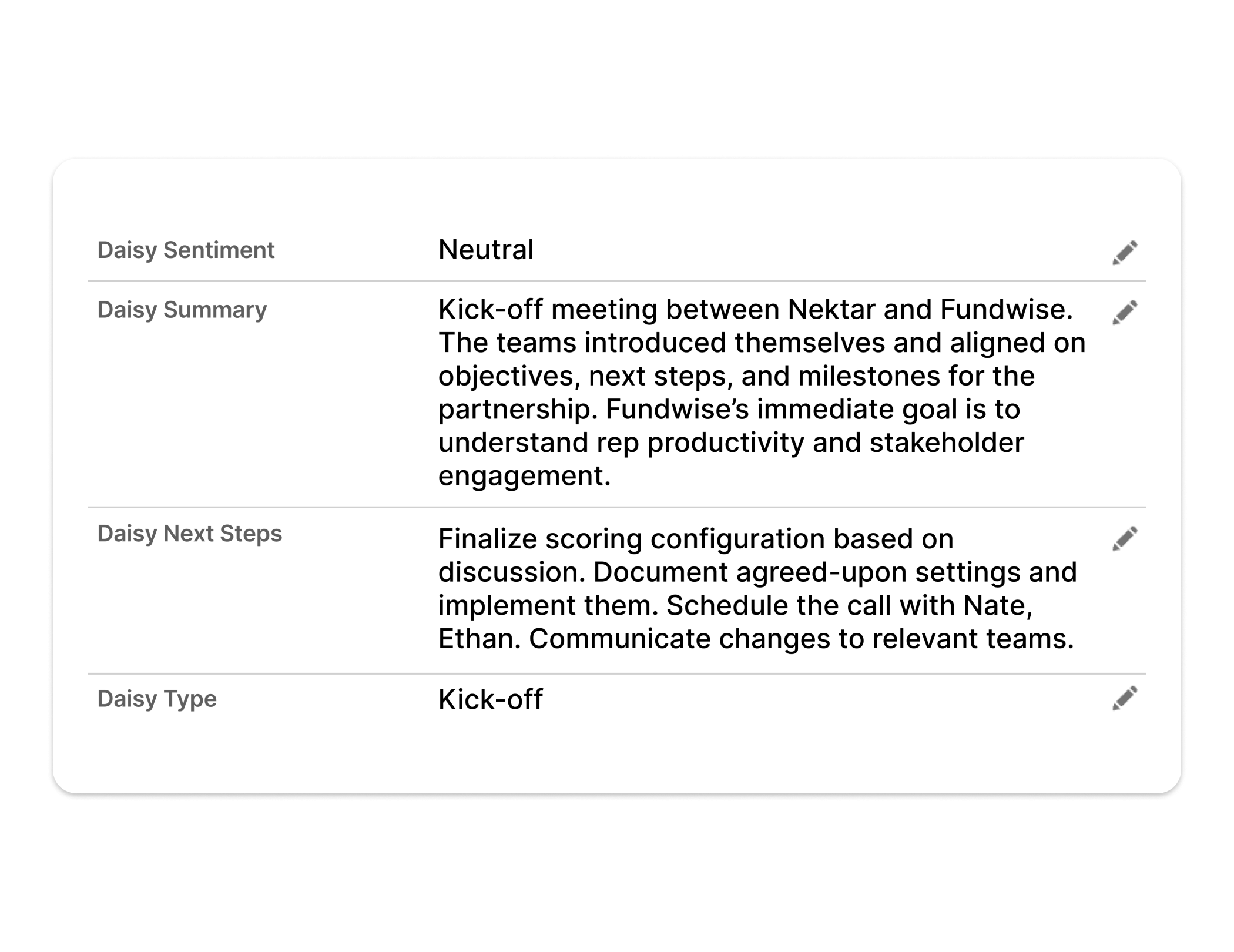 Knowing an email was sent isn’t helpful. Knowing what was said is. Nektar captures the actual conversation content and tone so your LLMs can understand objections, intent, competitor mentions, and deal momentum.