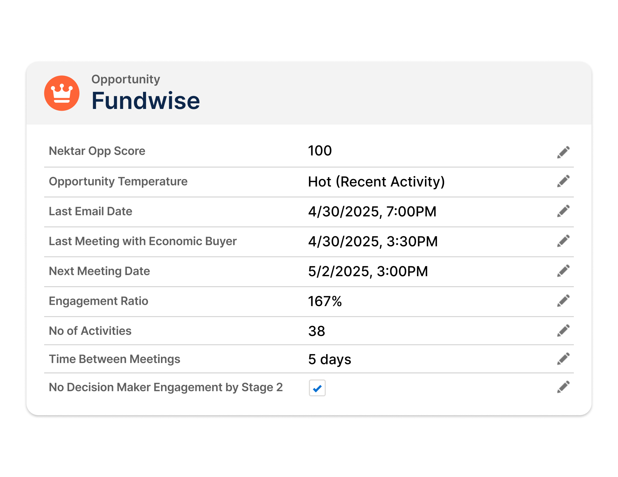 Nektar automatically captures who attended meetings, which deals are moving, and where stakeholders are disengaging—tracked in Salesforce with zero rep work.