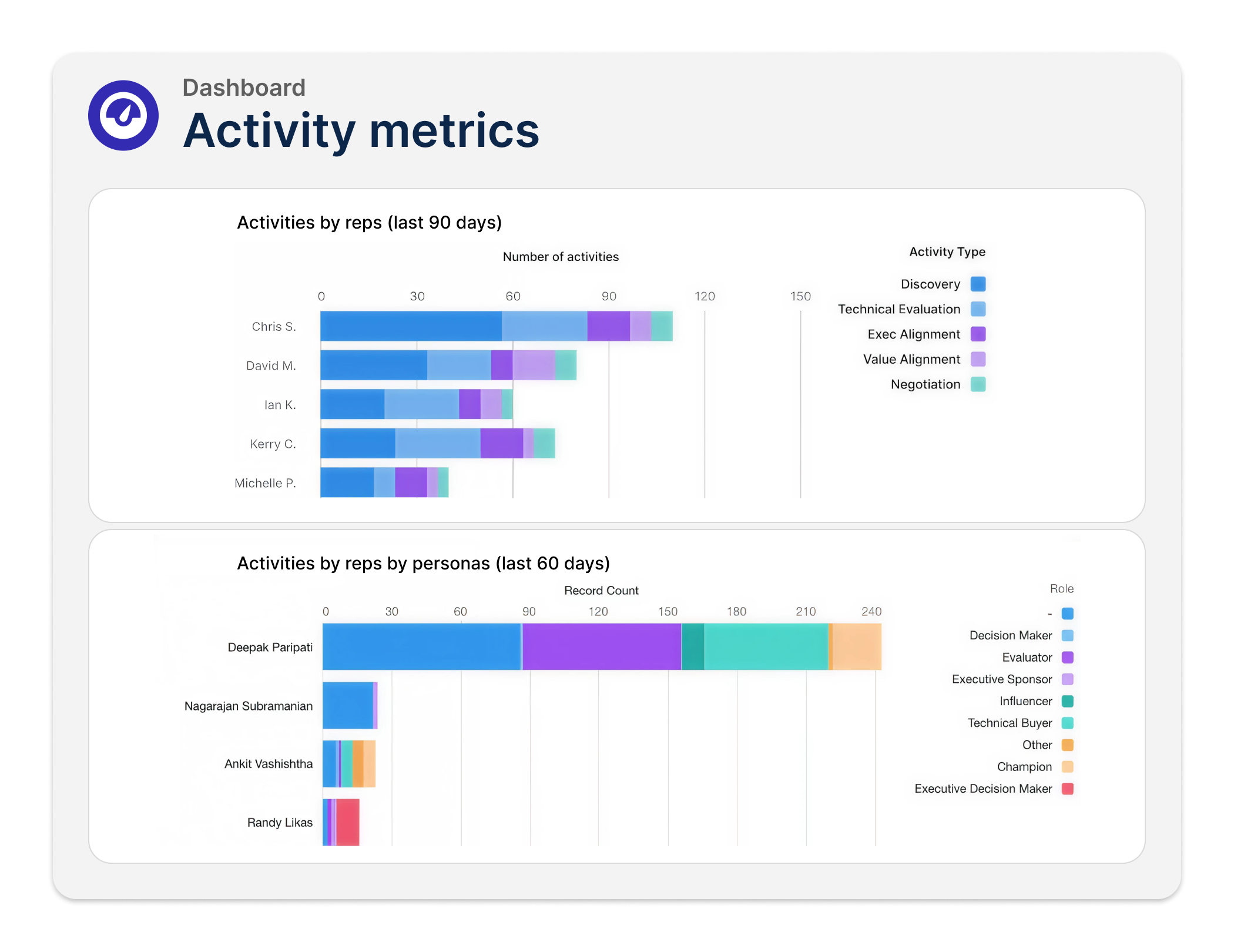 - Discover exactly how many engaged contacts and meetings it takes to win. (e.g., Deals with 6+ stakeholders and 3+ Economic Buyer meetings close at 68% win rate vs. 12% for single-threaded deals).