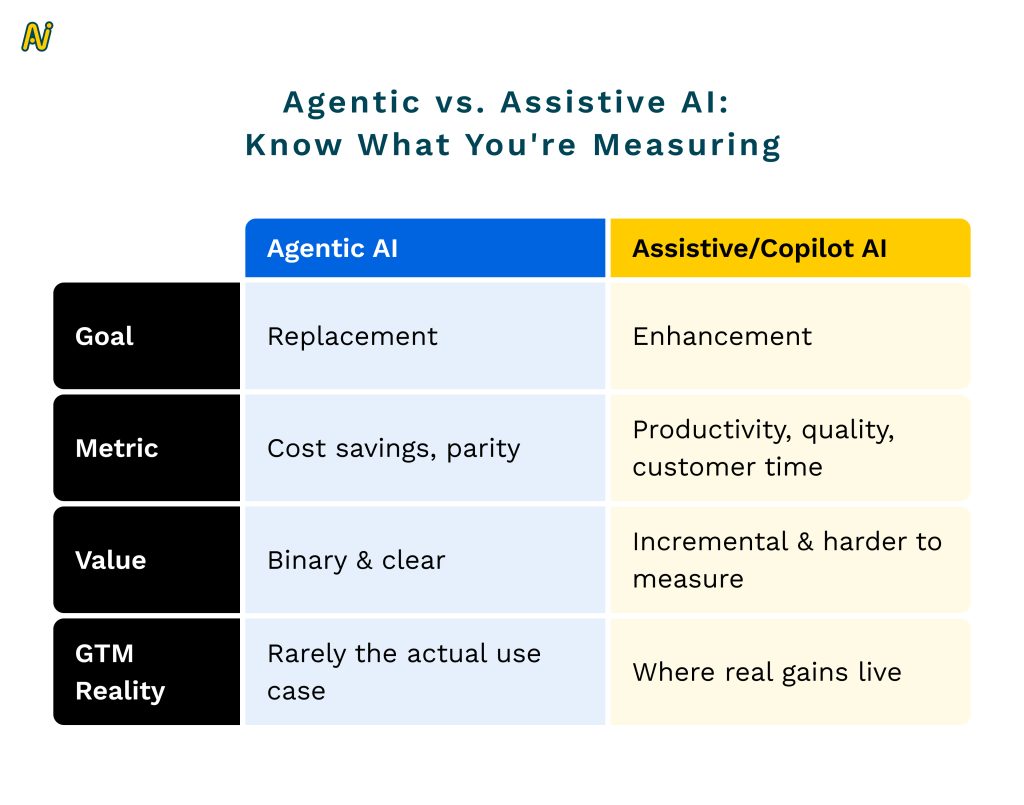 Agentic vs Copilot AI are different games: agentic is replacement (parity + cost savings), copilot is augmentation (productivity + more customer time).